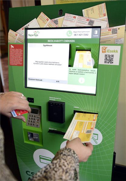 Csekkbefizető automata üzemel a Nyugati pályaudvarnál lévő budapesti 62-es számú postán 2015. február 9-én. Az országban húsz helyen, bevásárlóközpontokban, illetve postákon működnek ettől a naptól csekkbefizető automaták. Az automaták közül 11-et a fővárosba, illetve annak agglomerációjába telepítettek, de került belőlük Debrecenbe, Győrbe, Kecskemétre, Miskolcra, Szegedre, Székesfehérvárra és Szombathelyre is. MTI Fotó: Kovács Tamás