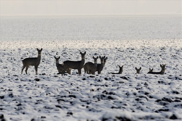 Őzek (Capreolus capreolus) egy havas szántóföldön Debrecen határában 2016. január 21-én. MTI Fotó: Czeglédi Zsolt