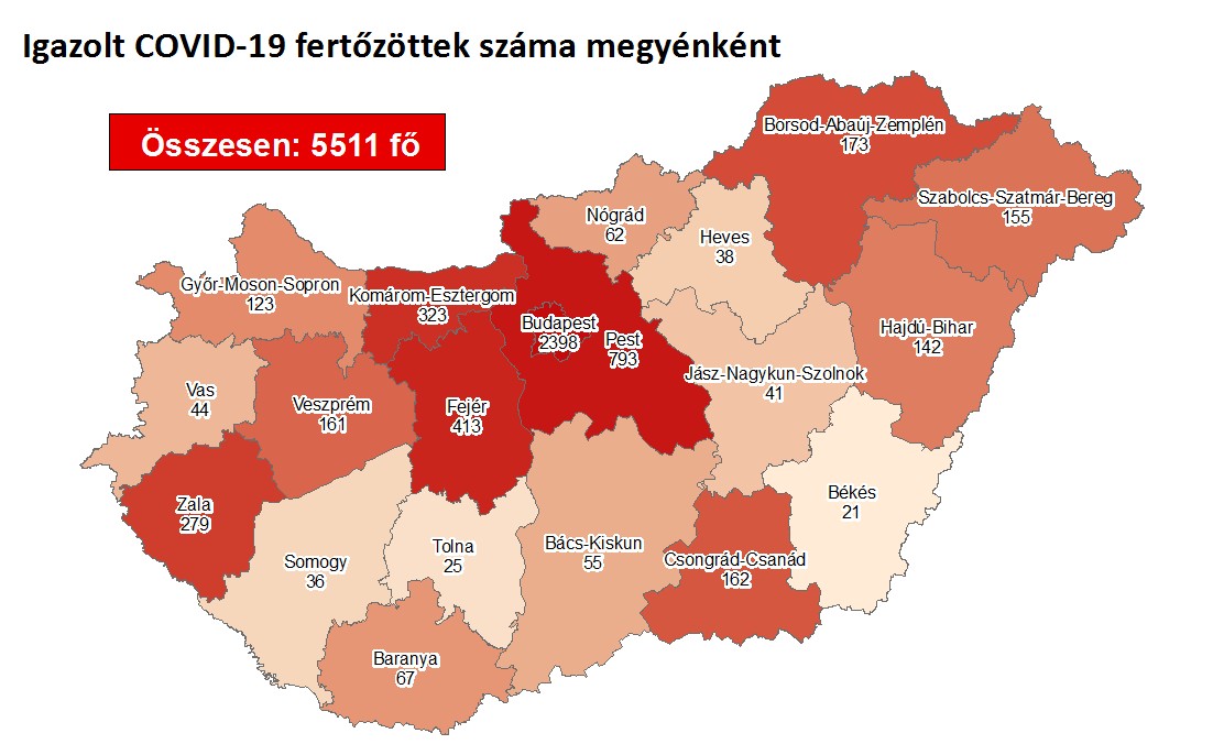 A kormányzati portálon azt írták: a 132 új beteggel 5511-re nőtt a Magyarországon azonosított fertőzöttek száma. Az elhunytak száma változatlanul 614, 3759-en már meggyógyultak.