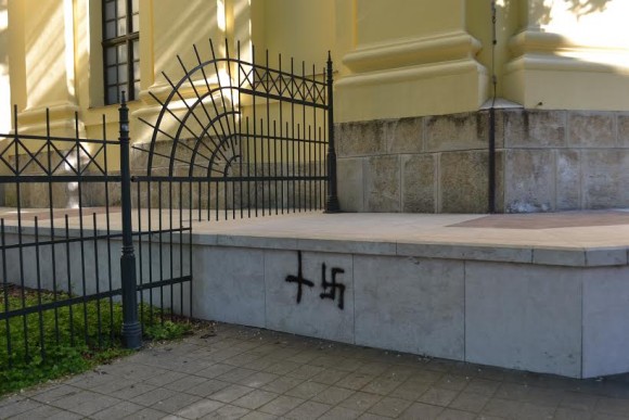 A két fiú április 16-án este a Nagytemplom oldalfalánál, a márványlapokkal kirakott lábazatra fekete festékkel horogkeresztet és egy fordított keresztet festett, ezzel 80 ezer forintos kárt okozott.