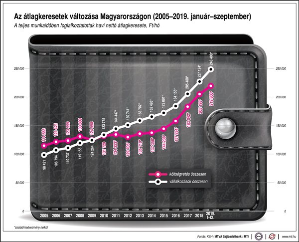 A nettó átlagkereset kedvezmények nélkül 239 300 forint, a kedvezményeket is figyelembe véve 246 700 forint volt az első kilenc hónapban. A bruttó és a kedvezmények nélkül számított nettó átlagkereset egyaránt 10,8 százalékkal nőtt 2018 azonos időszakához képest.