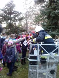 Az ajándékok átadása után a gyerekek csillogó kis szemekkel, boldogan adták át a tűzoltóknak a maguk készített díszeket, hogy azokat emelőkosár segítségével feltegyék a több méter magas fenyőre.