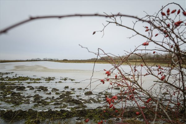 Megfagyott belvíz egy szántóföldön Földes és Berettyóújfalu között 2015. február 9-én. Több mint 125 ezer hektárnyi területen áll a belvíz, tíz vízügyi igazgatóság területén negyvenhat belvízvédelmi szakaszon rendeltek el készültséget. MTI, fotó: Czeglédi Zsolt