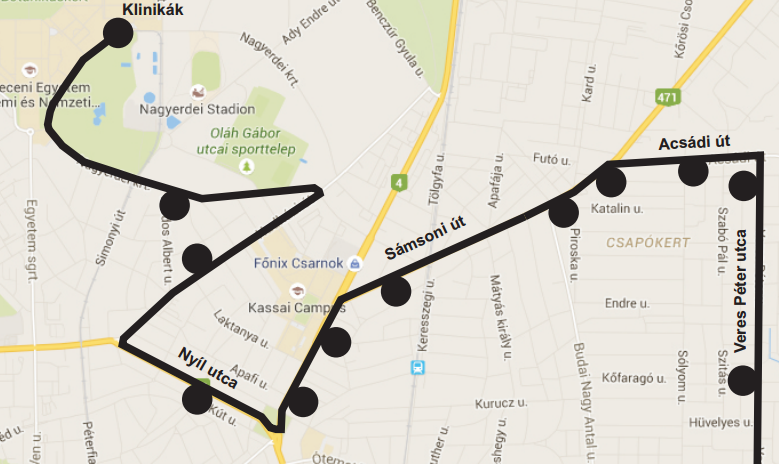 Klinikák ideiglenes forduló – Nagyerdei körút – Hadházi út – Nyíl utca – Árpád tér – Kassai út – Sámsoni út – Acsádi út – Veress Péter utca – Vámospércsi út – Hétvezér utca – Diószegi út – Borzán Gáspár utca – Monostorpályi út – Mikepércsi út – Nagyállomás