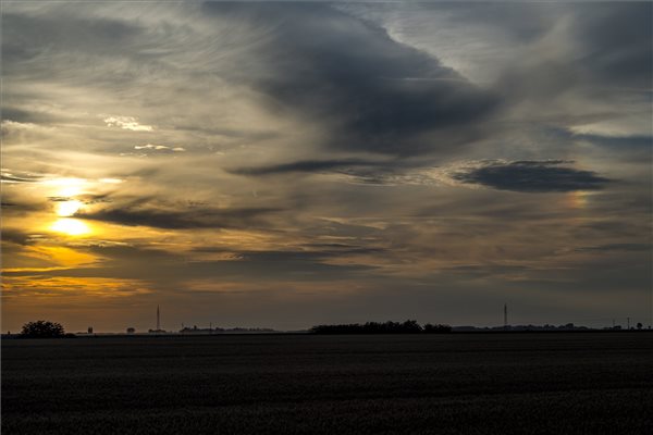Melléknap (parhelia) vagy naphalo nevű légköri jelenség naplementekor Debrecen határából fotózva 2017. június 27-én. A fénytüneményt a levegőben levő jégkristályokon megtörő fény hozza létre elsősorban fátyolfelhőkön. MTI Fotó: Czeglédi Zsolt