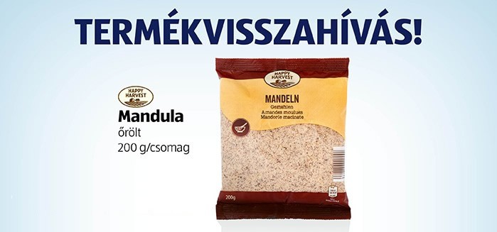 A közlemény szerint a Happy Harvest Őrölt mandula 200 grammos kiszerelésű termékének azt a sorozatát hívták vissza, amelynek a minőségmegőrzési ideje 2020. április 13-án jár le. A terméket a vásárlók az Aldi bármely magyarországi üzletébe visszavihetik, az áruházlánc a vételárat a vásárlást igazoló blokk hiányában is visszatéríti.